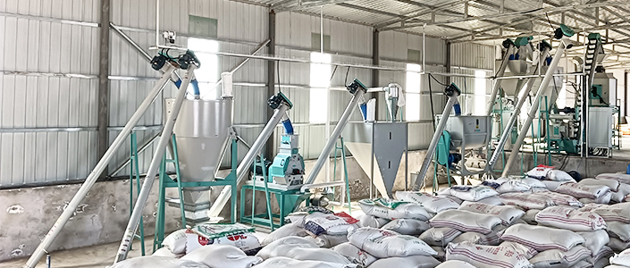 成套饲料加工设备安装进度的有:安装完成的河北时产3-5吨粉状饲料加工机组;正在安装的四川时产5吨预混...
